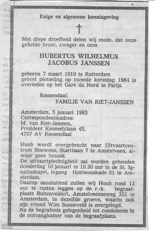 Op 2 januari 1985 sterft Huub aan een hartaanval op het Gare du Nord in